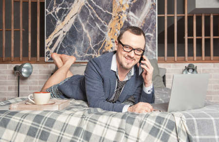 Handsome barefoot man wearing suit and underpants working at home online and talking on smartphone lying down on the bed