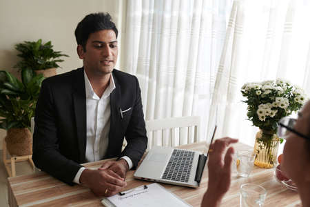 Businessman meeting with young agent at co-working, sitting at open laptop, taking pen for signing agreement. Medium shot. Consulting or cooperation concept