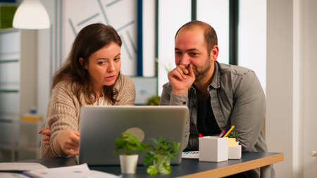 Selective focus. Two young business partner using laptop and pointing on screen during meeting in office. Startup businessmen discussing looking through online idea for business project on internet.