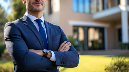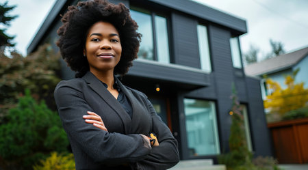 Successful black realtor standing in front of modern luxury real estate she sold for upscale clients