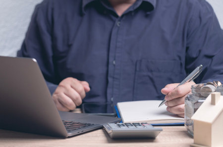 A man with a savings account calculates the amount of money he can save this year. Real Estate and account or saving money or insurance concept.