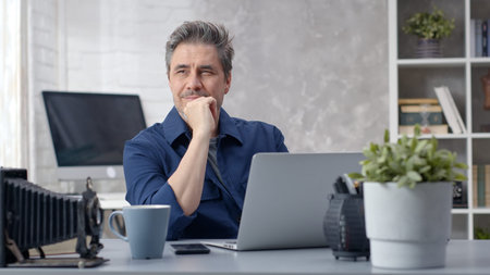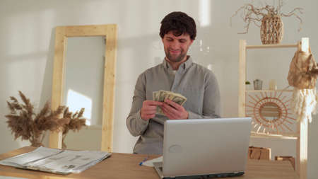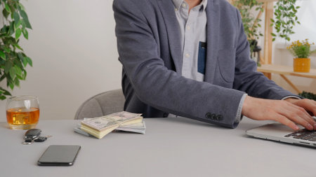 Business man sitting at office desk works on laptop, takes wad of cash drops on the table.