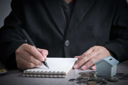 Businessman write income and expenses on notebook with house piggy bank and coin on table, business and saving money concept