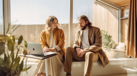 Young businessman and woman working from home-office with morning sunshine. they are communicating on social networks and searching for information online.