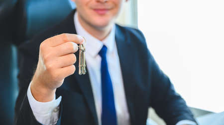 Real estate agent giving house keys to client. Property investment and financial mortgage