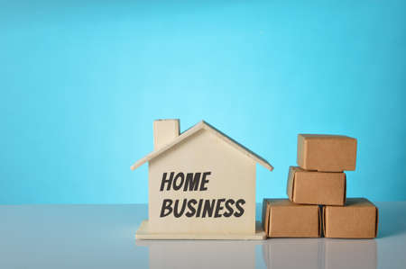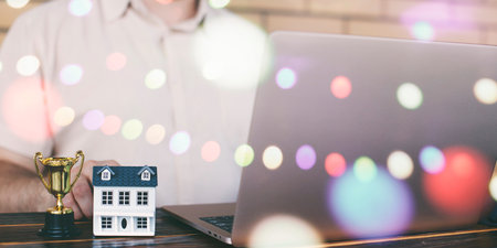 Small house model and keys on wooden table at real estate office . Real estate investment concept.
