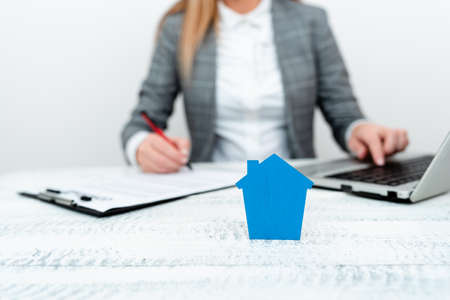 A Lady Holding Home In Business Outfit Presenting Possible Calculations For Owning Real Estate. Signing New Contract Orinsurance Ormortage Concept Shown By The Young Businesswoman.