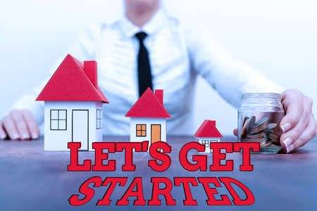 Text sign showing Let S Is Get Started. Word Written on to begin doing or working on something you had started Different plans for houses represented by business woman