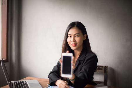 Office time, Asian young woman working in office With stress and business communication through mobile phones, executives, business women