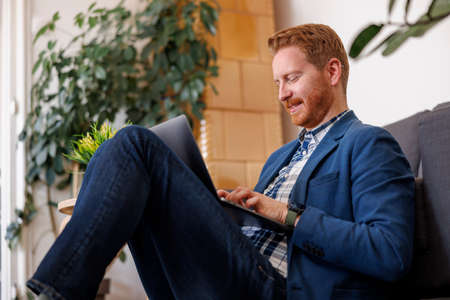 young caucasian male working from home typing on digital laptop relaxing in modern bedroom