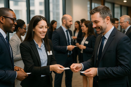 A diverse group of smiling business professionals in formal attire are actively engaged in networking, exchanging business cards at a modern corporate event or conference. The image highlights successful communication, connection, and relationship building in the business world.