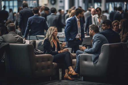 A corporate event with people networking and mingling. --ar 3:2 Job ID: f1e0cc97-8a6b-4bfb-8a45-787525ec4118