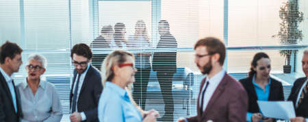 Group of business people in the hall of the modern office building.
