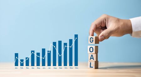 Hand arranging wooden cube block the word GOAL. Business growth concept