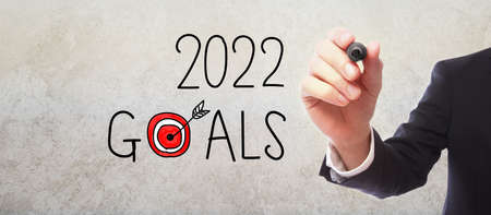 Business plan concept 2022. Text budget, plan, goals 2022 written on colored rectangles on dark blue background