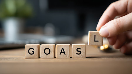 Hand Holding Letter L with Wooden Blocks Spelling Out Goal on a Desk with Blurred Background for Motivation and Achievement Concept
