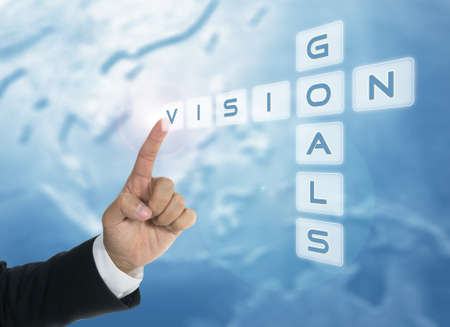 Planning ideas and strategies for achieving business goals. Businessman pointing finger at a wooden block, goal.