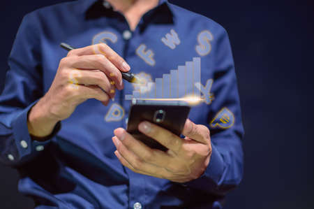 Businessman with a tablet in his hand And touching on the screen That shows a business graph. The concept of starting a new business that goes better.