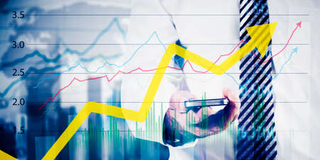 Double exposure to financial and economic growth graphs A businessman touches a chart of business and finance stock market trading and stock exchange over a global network.