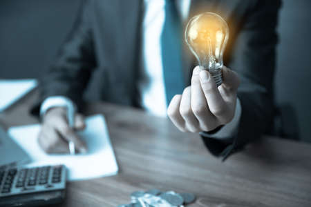 Creativity and innovation are keys success concept, businessman hand holding light bulb with using calculator to calculate and money stack. idea saving energy and accounting finance in office concept