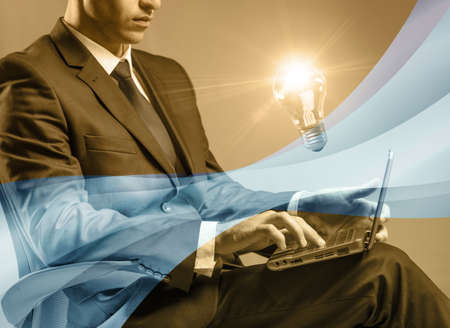Young businessman with laptop and lamp idea concept