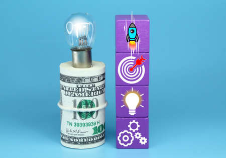 Adding business ideas to make money from online stores. Hand holding light bulb creative icon on wooden cube block with money icon. Business growth idea.