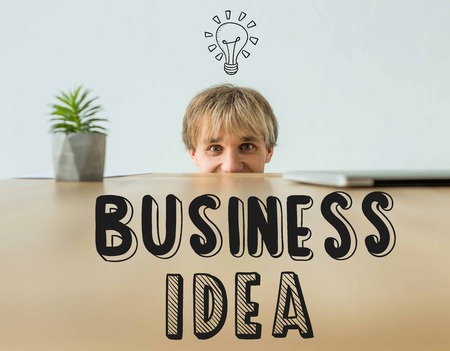 Man looking out from table and looking at camera with business idea inscription and light bulb icon
