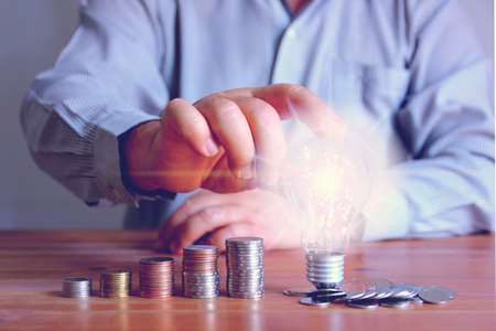 hand holding light bulb shining on group of coin , idea saving concept