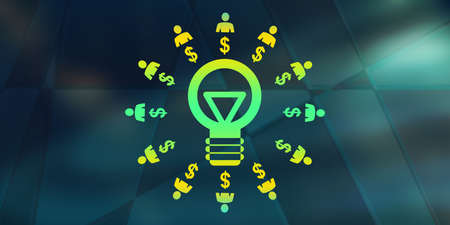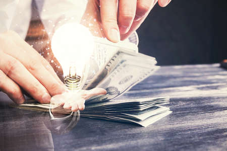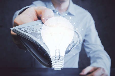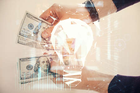 Multi exposure of bulb drawing hologram and USA dollars bills and man hands. Business Idea concept.