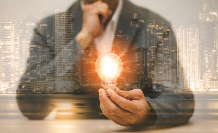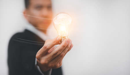 Concept creativity with light bulbs and energy power, Man hand holding light bulbs, ideas of new ideas with innovative technology, Creativity, bulb future technology, innovation background,