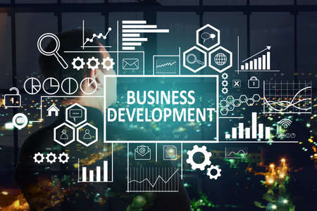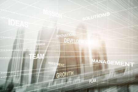 Business concept. Business development words over night light cityscape multiple exposure modern background. Text typography design