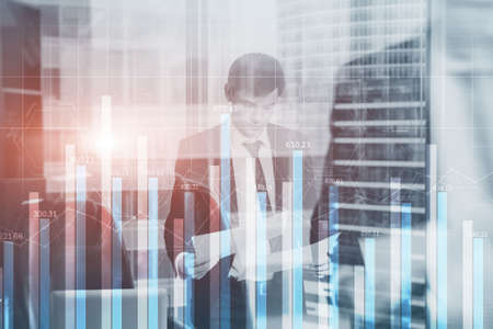 financial analytics, business team working on charts and big data on screen of computer, double exposure