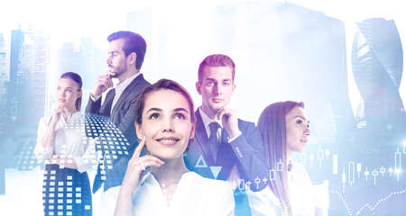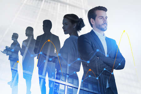Portrait of business people standing together in city with double exposure of financial graphs. Toned image