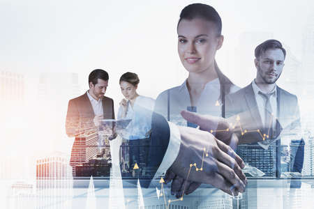Portraits of business people working together in blurry city with double exposure of handshake. Concept of teamwork and partnership. Toned image