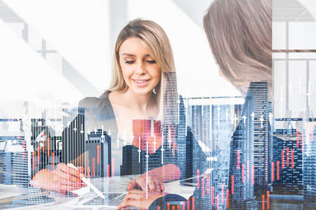 Businesswomen wearing formal suits are making contract for a profitable deal watching at laptop screen. Office workplace, Singapore and bar diagram in background. Concept of trading on stock market