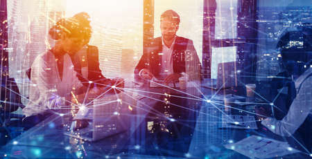 Double exposure of colleagues at business meeting and modern city. Concept of business consulting