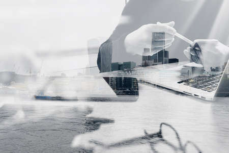 Double exposure of Photo website graphic designer hand meeting team with new project modern studio.Modern laptop digital tablet smart phone with London architecture,building