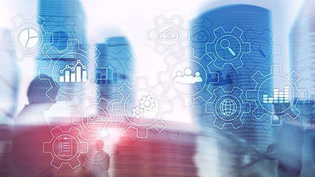 Business process abstract diagram with gears and icons. Workflow and automation technology concept.