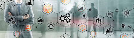 Business process abstract diagram with gears and icons. Workflow and automation technology concept. Website header banner.
