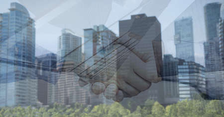 Animation of businessmen shaking hands over cityscape. business, finance, negotiations and success concept digitally generated image.
