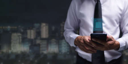 woman hand working with phone on wooden desk in office. can be used on advertising