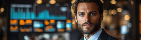man in a black shirt stands in front of a holographic graph with growing indicators. business growth, sales growth. High performance