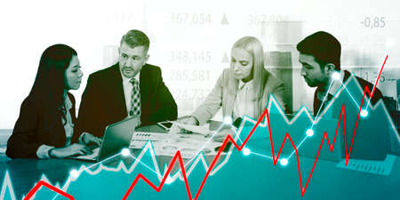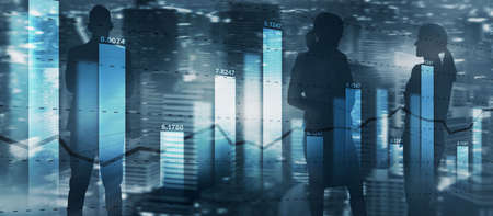 Double exposure of diversity business people analyzing growth business chart with currency exchange rate background