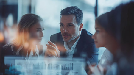 Business team having a discussion in a modern office with data graphics overlay. Concept of corporate strategy, teamwork, and financial planning.