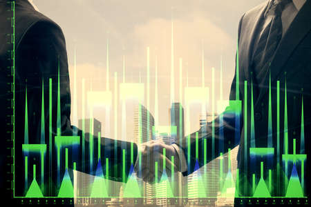 Double exposure of forex graph hologram and handshake of two men. Stock market concept.