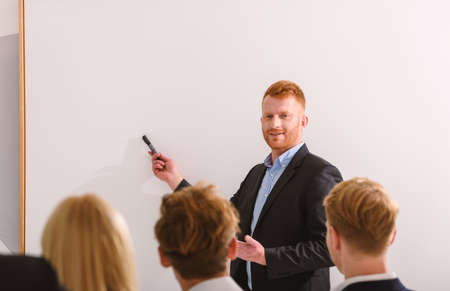 Serious speaker standing near whiteboard and gesturing. Group of employees discussing ideas during presentation of new project at briefing. Business meeting concept