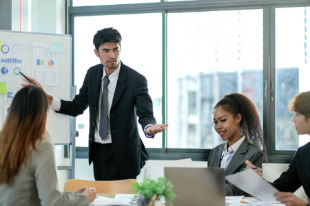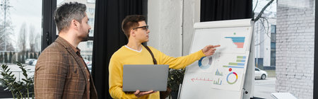 Businessman pointing towards graph and giving Flipchart presentation explaining the idea to diverse partners in the office. Banner cover design of business people meeting