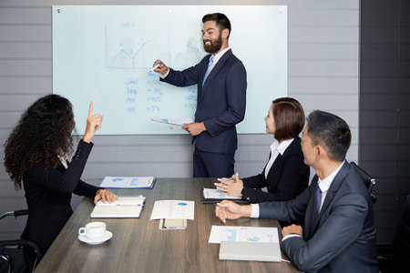 Pensive businessman looking at his coworker pointing at financial chart and explaining results of new marketing strategy implementation