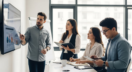 Business executive making presentation to colleagues in office, during meeting, explaining, consultation.