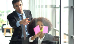 Professionals Businessman and businesswoman discussing over sticky notes to share idea on board in office, brainstorming concept